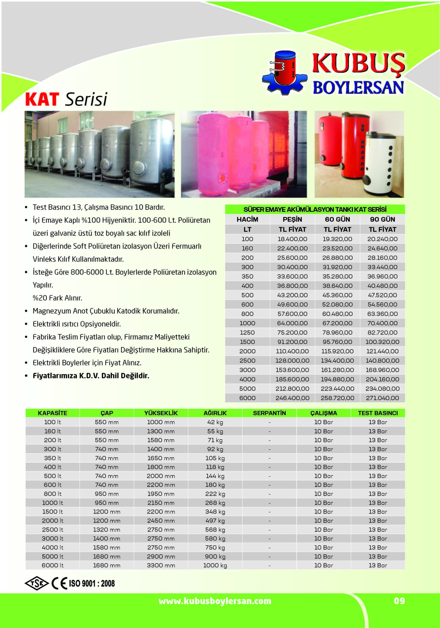 | Kapasite | Çap | Yükseklik | Ağırlık | Serpantin | Çalışma Basıncı | Test Basıncı |